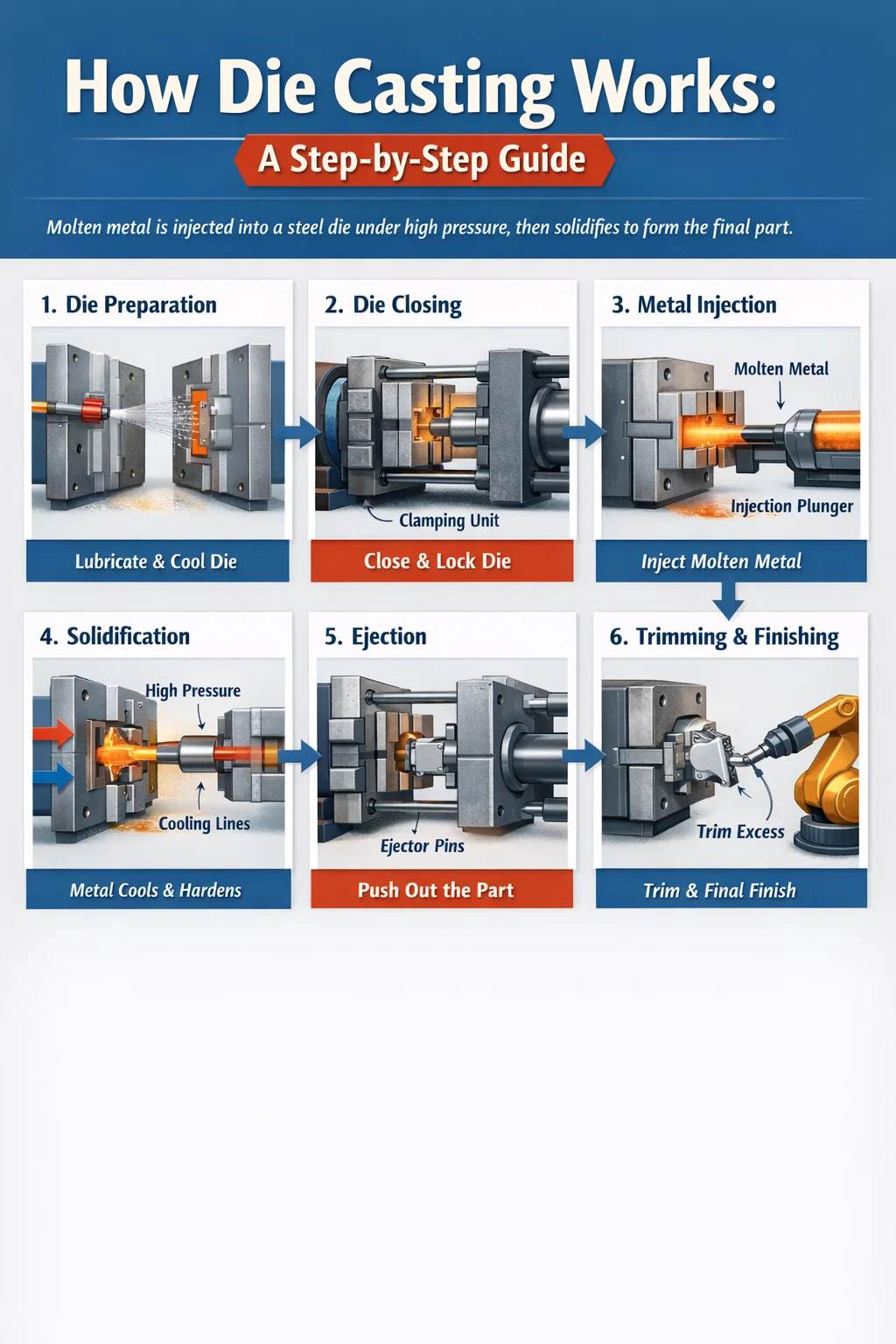 Pressestøping er en metallformingsprosess der smeltet metall injiseres under høyt trykk i en herdet stålform - kalt en dyse - og holdes der til metallet størkner til den nøyaktige formen til hulrommet. Når den er solid, åpnes dysen, ejektorstifter skyver delen ut, og syklusen begynner på nytt. En enkelt terning kan gjenta denne sekvensen hundretusenvis av ganger før den slites ut.