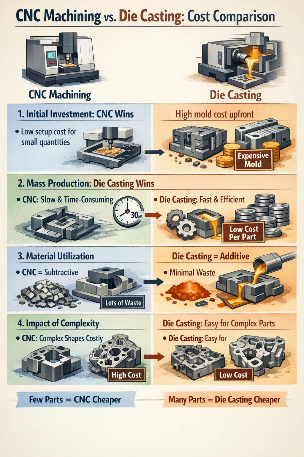 Hastighet bestemmer kostnadene: Trykkstøping kan "produsere" en del på sekunder, mens CNC kan ta en halvtimes grundig arbeid. Tid er penger, og i storskala produksjon kan effektiviteten til trykkstøping drive enhetskostnaden ned til et svært lavt nivå.
