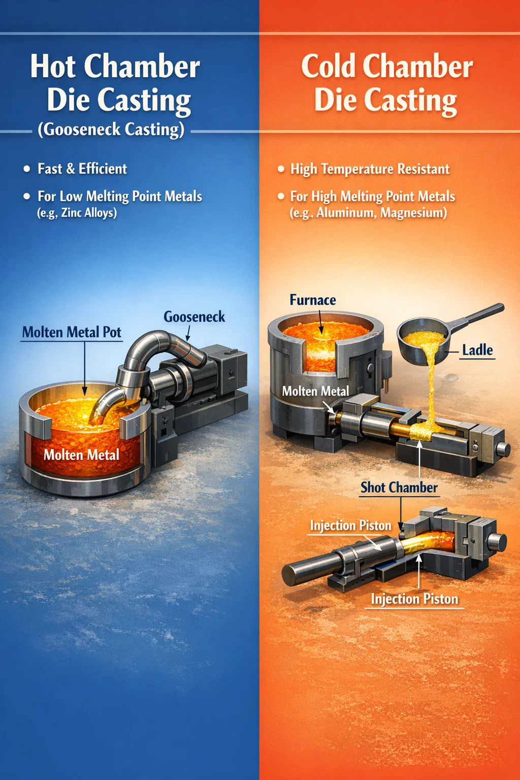 | Funksjon | Hot Chamber Die Casting | Cold Chamber Die Casting |