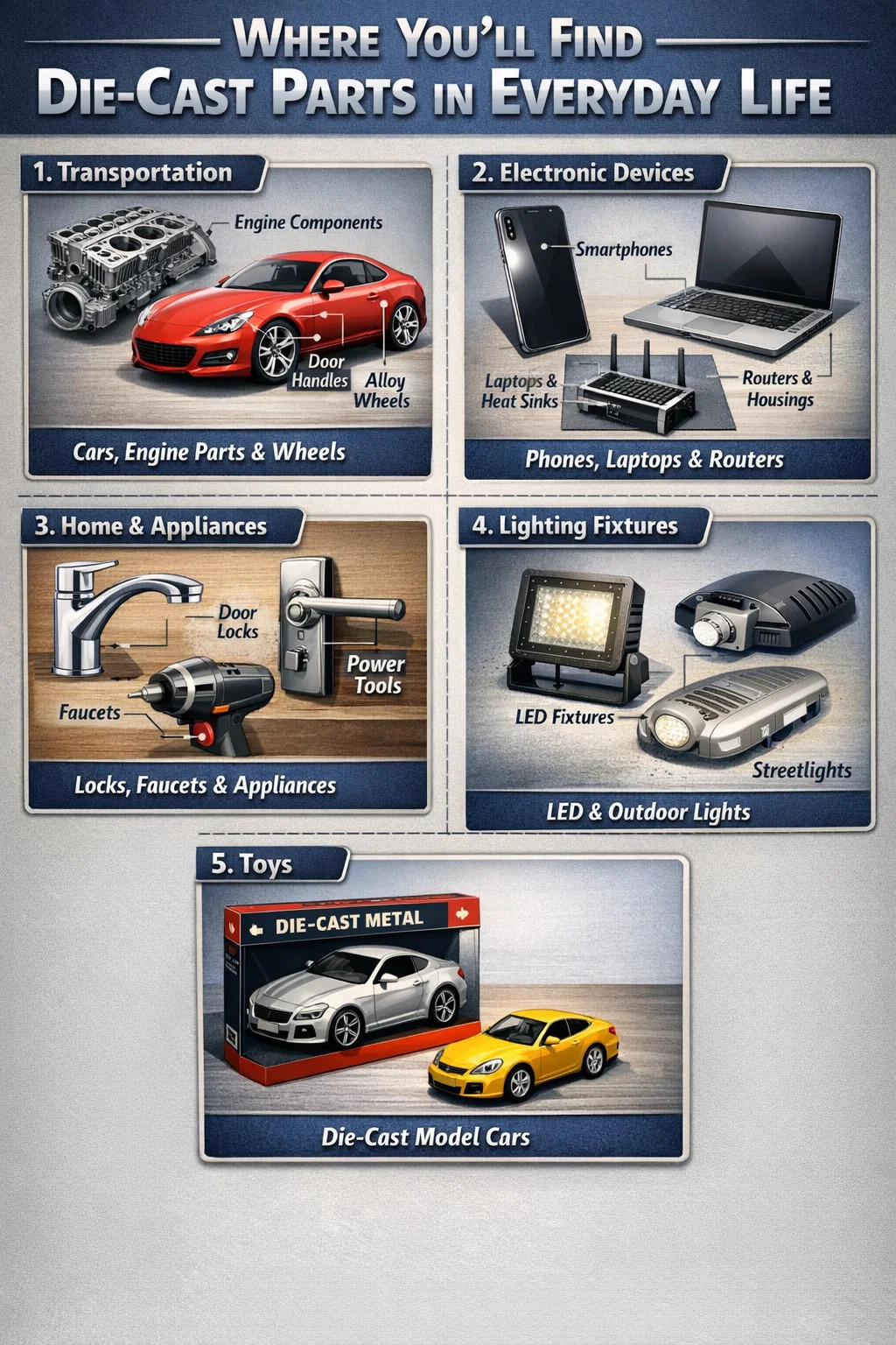 Pressstøpte deler er praktisk talt overalt i livene våre. Bare se deg rundt, og du vil finne at mange av de kule å berøre, intrikat formede og solide metallgjenstandene er laget ved hjelp av denne prosessen.