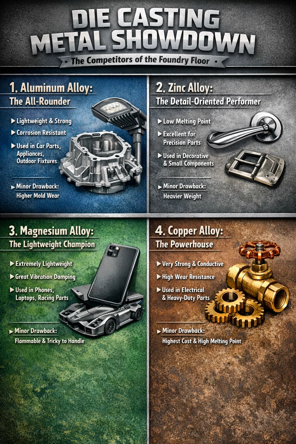 Når det kommer til hvilket metall som passer best til formstøping , det er ikke noe absolutt "nummer én", da det avhenger av hva du vil bruke det til. I fabrikker er de tre mest brukte metallene aluminium, sink og magnesium.