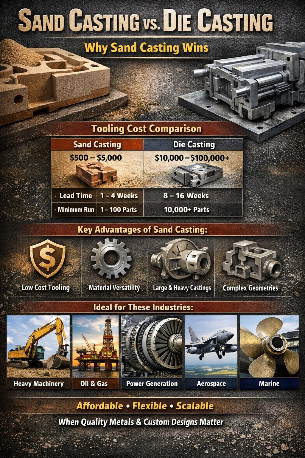 Det korte svaret: Sandstøping vinner på kostnader, fleksibilitet og skala