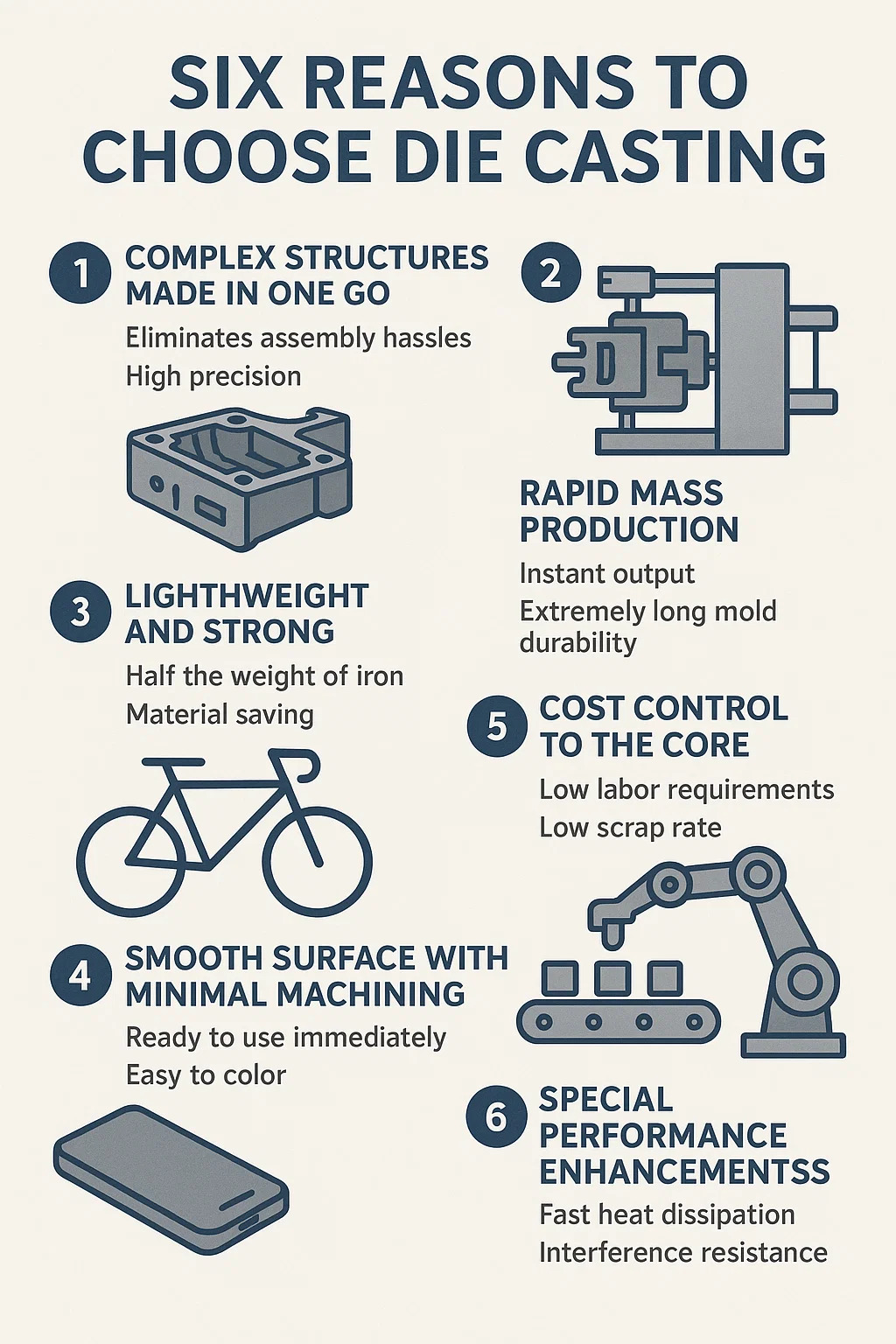 Klar til bruk umiddelbart: Pressstøpte deler har en naturlig metallisk glans (som rammen på en ny telefon), noe som eliminerer behovet for polering.